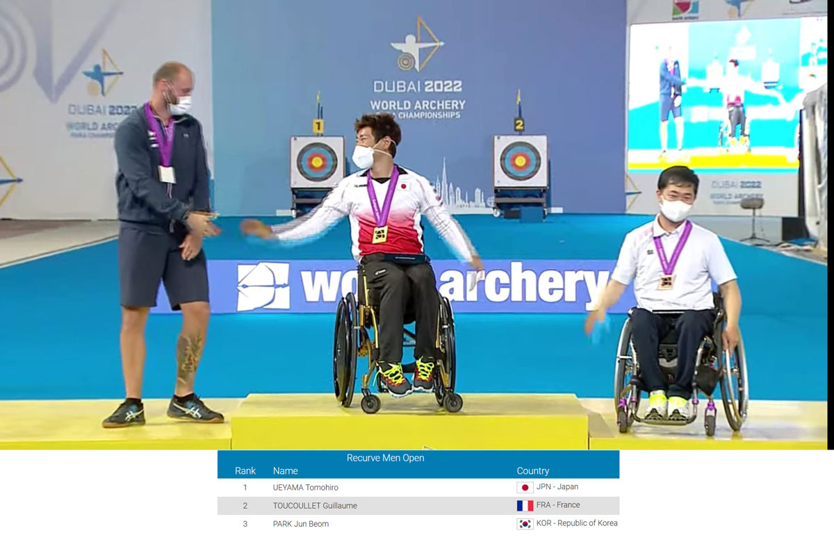 Les Championnats du monde para-archerie individuel se sont déroulés à Dubaï (EAU) du 19 au 27 février 2022. L’équipe de France comptait dans ses rangs 3 Néo-Aquitains en arc à poulies Julie CHUPIN RIGAULT (Ruelle) et Maxime GUERIN (Rochefort), en arc classique Guillaume TOUCOULLET (Biarritz).