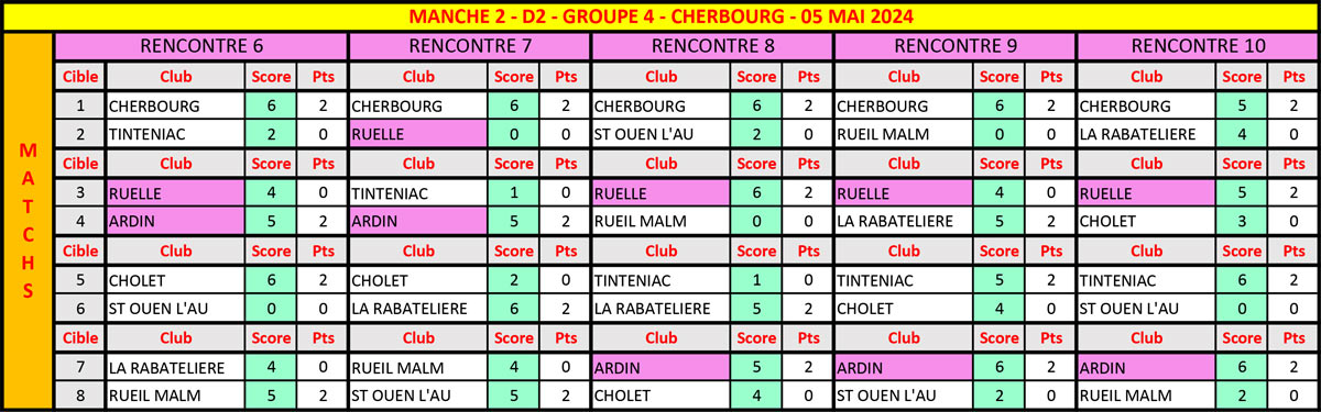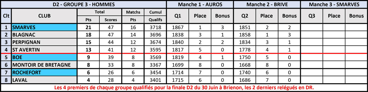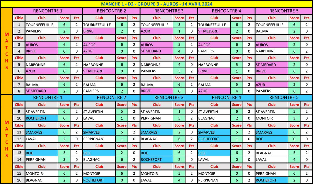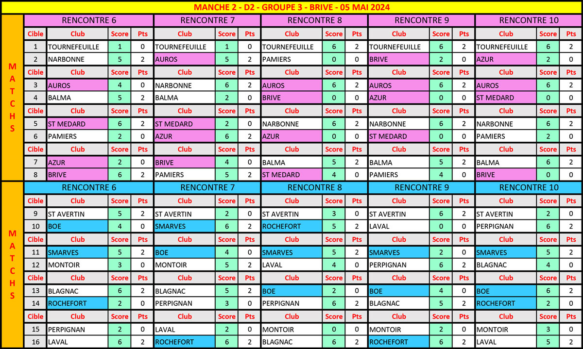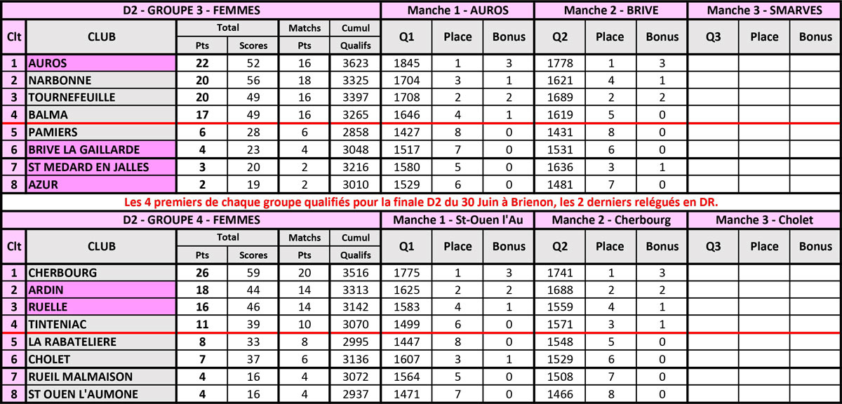 En Classique Femme groupe 4, nos deux équipes n’ont point sorti les ‘’parapluies de Cherbourg’’ (et c’est pas du cinéma), sur le terrain de l’équipe locale qui ne fit point dans la dentelle en dominant largement ce groupe. Mais de belles prestations sont à noter puisqu’Ardin prend la 2ème place en remportant tous ses duels et 2 pts de bonus👏👏, Ruelle passant 3ème à deux pts avec 2 duels gagnés et 1 pt de bonus👏. Dans le groupe 3, c’est un copier/coller de la précédente manche pour les filles d’Auros, qui s’octroient 4 duels et les 3 pts de bonus obtenus aux qualifs👏👏👏. La situation ‘’comptable’’ reste toujours délicate pour nos 3 autres équipes régionales puisque Brive est 6ème avec 4 pts, St-Médard, 7ème avec 3 pts et Azur ferme la marche avec 2 pts. Tout va se jouer lors de l’ultime manche à Smarves (86) entre 4 équipes afin d’assurer le maintien en D2.
