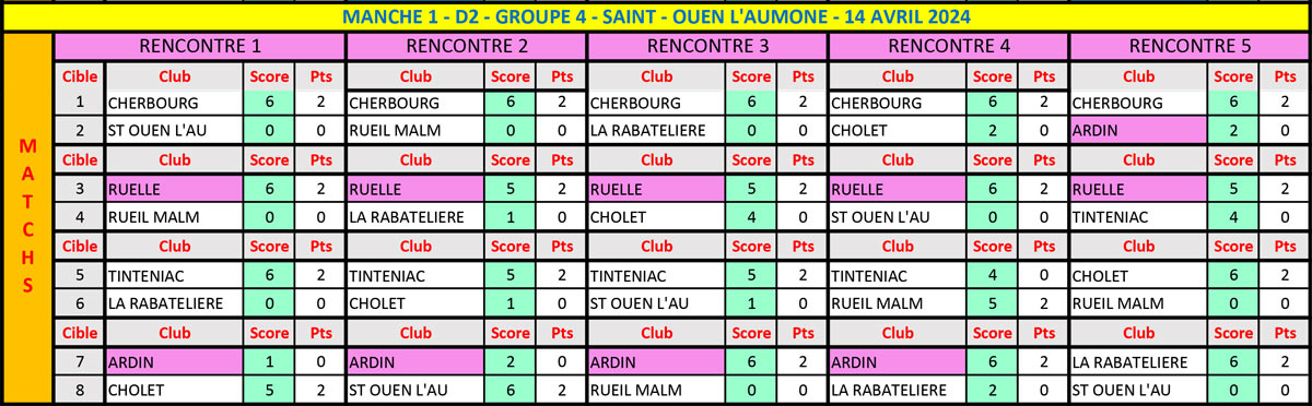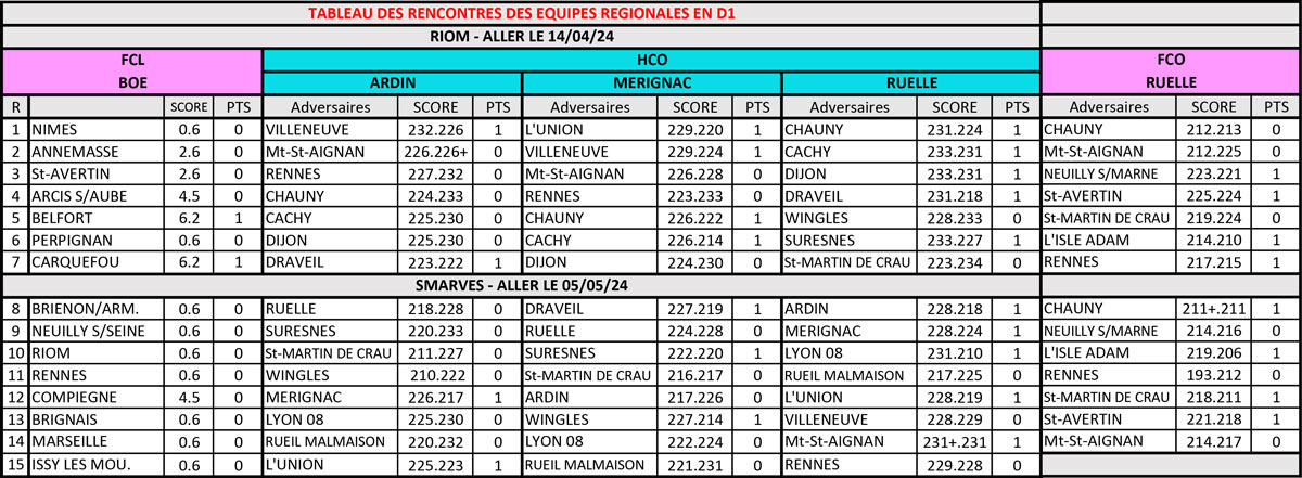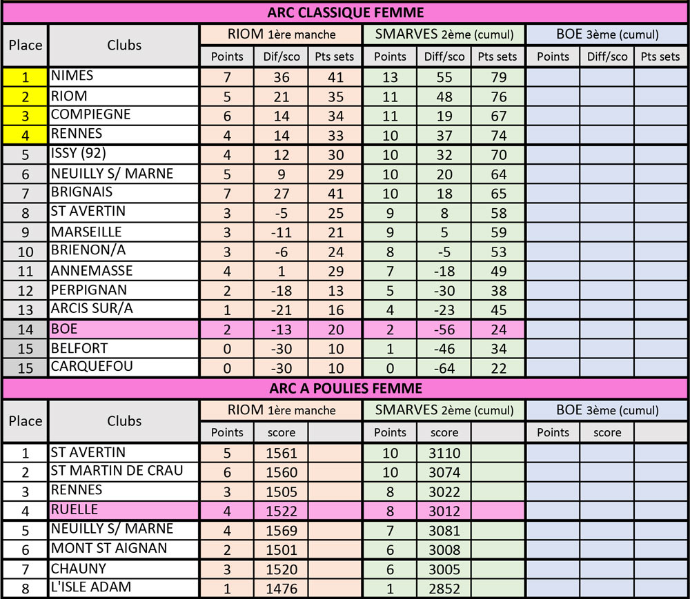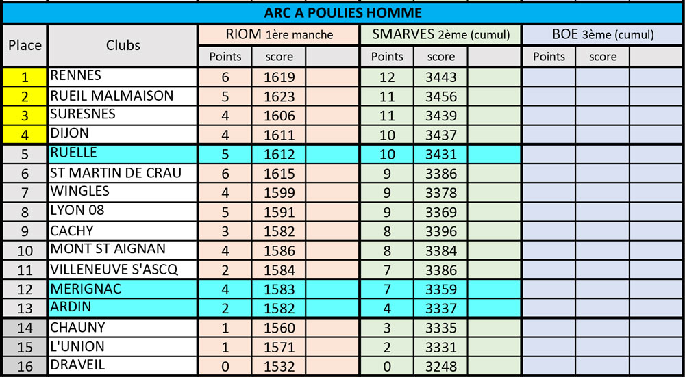 En Classique Femme, les jeunes Boétiennes ne réussirent point à remporter un duel, perdant deux places au classement. Il faudra donner le meilleur, à domicile lors de l’ultime manche pour espérer rester dans l’élite. En arc à poulies Femme, Ruelle gagne à nouveau 4 de ses 7 rencontres, ce qui leur permet de conserver leur 4ème place au général. Chez les Hommes ‘’poulies’’, 10 équipes se tiennent en 4 points, dont Ruelle, à l’affut du dernier carré, après ses 5 nouvelles victoires du jour. Mérignac, avec 3 victoires compte 7 points et glisse à la 12ème. Trois points derrière suit Ardin, se maintenant à sa 13ème place, synonyme de maintien…