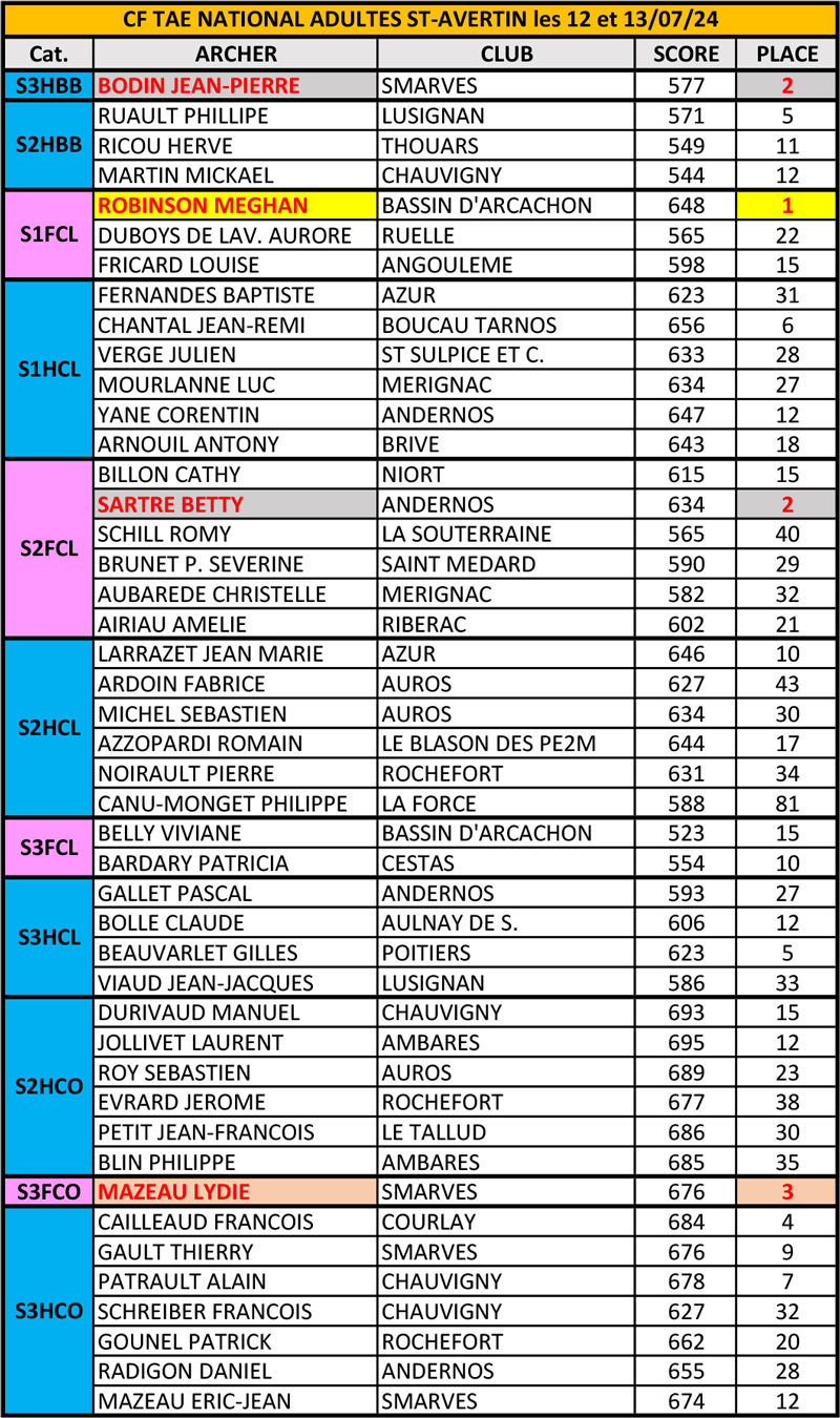 Parmi les 45 régionaux sélectionnés sur la distance, seule Meghan Robinson, du Bassin d’Arcachon décroche le titre de Championne de France en S1FCL avec 648 pts. Vice champion de France, Jean-Pierre Bodin (S3HBB), de Smarves avec 577 pts. Samedi matin, en S2FCL, Betty Sartre, d’Andernos repart avec l’Argent en poche grâce à ses 634 pts, le Bronze pour Lydie Mazeau, de Smarves avec 676 pts. Résultats complets des ‘régionaux’’ ci-contre.
