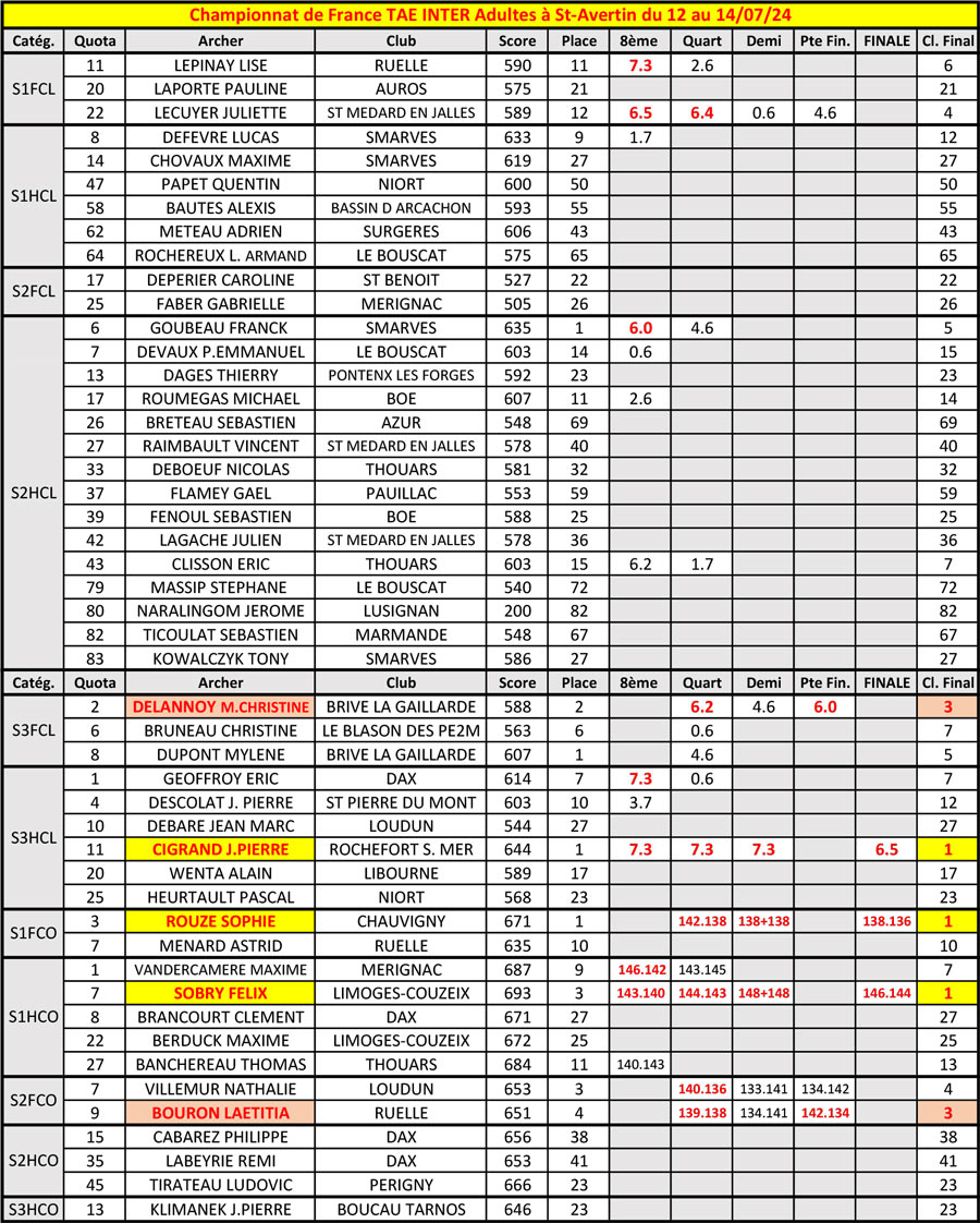 Le grand RDV (12 au 17) des championnats de France TAE à St-Avertin a commencé par les catégories Adultes, en tir National, un concours sans duels qui donna dès vendredi après-midi les premiers titres de Champions.