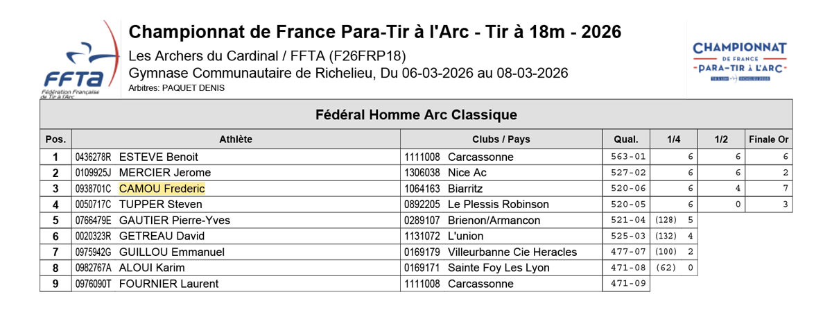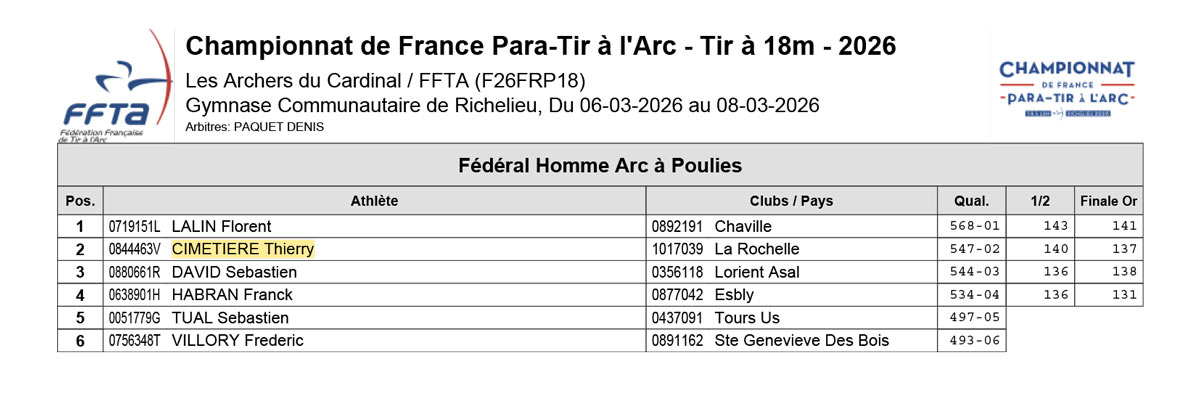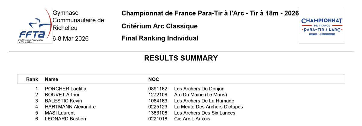 Les CF individuels para tir à l’arc à 18m se sont déroulés à Richelieu du 6 au 8 mars 2026. 12 archers Néo-Aquitains y participaient.